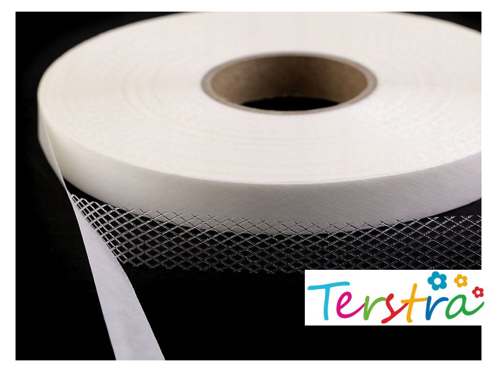 Fixační pásku položte mřížkou na okraj rubové strany lemu. Přes papír zažehlete žehličkou na 100 stupňů celsia 15 sekund. Nyní papírovou pásku odstraňte, lem zahněte a opět zažehlete. Zažehlování doporučujeme provádět přes další látku - např. kapesník. Vyhnete se tak lesklým obtiskům, které někdy žehlička na jemných látkách způsobí.
