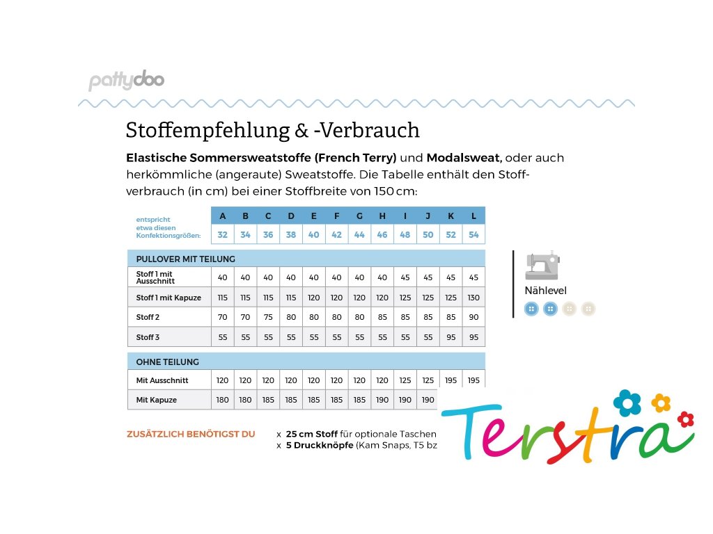 Střihový list ve formátu A0 obsahuje střihové díly pro všechny varianty od velikostí 32 do 54 a také brožuru s tabulkami velikostí, střihovými rozvrženími, pracovními kroky a tipy pro úpravu střihu.