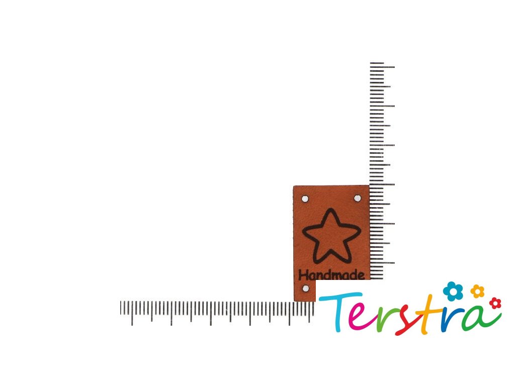Hnědý koženkový štítek s vypálenou hvězdou a nápisem Handmade ozdobí každý kousek oděvu, především pak čepice, nákrčníky, trička, šaty nebo mikiny.